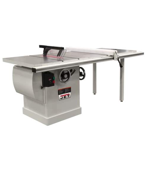Jet 708546PK JTAS-12-DX, 5HP 12-in Single Phase Left Tilt Deluxe Table Saw with riving knife and 80-in of solid cast iron work surface is guaranteed to see you through all your projects. The weight of this machine ensures stability for smooth cutting operation. Featuring a maximum rip of 14-in left of the blade for more capacity. Dust collection is improved thanks to a collection shroud around the blade and an integrated hose. All of this is backed byJet industry-leading 5-year warranty.