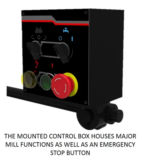 - The mounted control box houses major mill functions as well as an emergency stop button