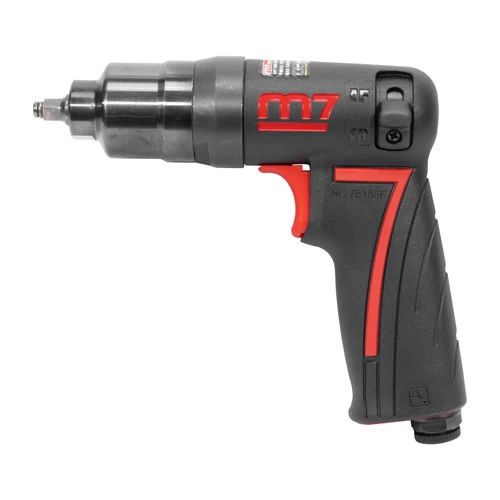 The M7 NC-2210N air impact wrench has a 1/4” drive. It is part of a product kit with six metric impact sockets from 9mm to 13mm. This air tool has a maximum forward torque of 45 ft-lb and a reverse torque of 50 ft-lb. This pneumatic impact wrench is great for attaching and loosening fasteners in various repair and maintenance settings.