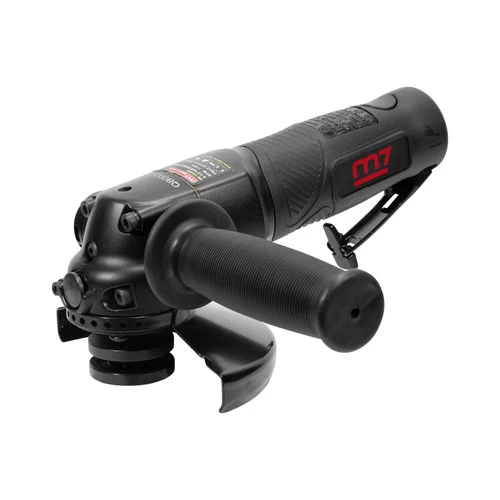 This M7 QB-7245M pneumatic angle grinder cuts through steel, concrete, and other materials. Its 100-degree design offers easy operation. This M7 air tool also features heavy-duty, air-cooled spiral gears and double bearings. These features make the tool’s 1.3 horsepower motor more durable. It also comes with a spindle lock that makes it easier to change grinder wheels.