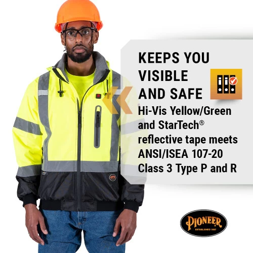 Pioneer Hi-Vis Waterproof Heated Safety Bomber Jacket – Class 3 StarTech Reflective Tape – Detachable Hood – Multiple Colors (Power Bank Not Included)