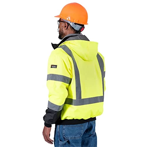 - Neon Glow Colored: Jacket comes in high visibility yellow with a black bottom to conceal soiling; Offers superior visibility and safety on the job, and is available in in men’s sizes Small to 4XL