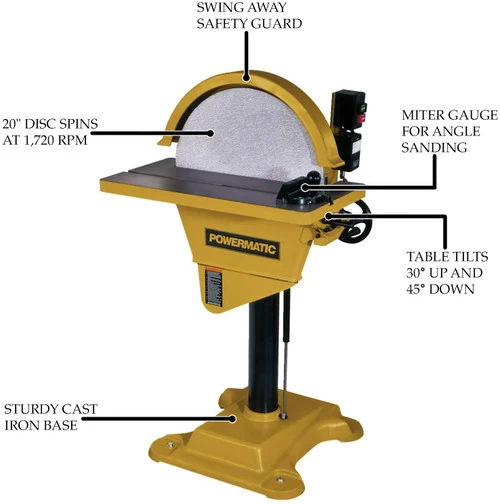 The DS20 20 Inch Disc Sander is ideal for the professional or serious home woodworking shop. It has direct drive from motor to disc for maximum efficiency, with a hand activated brake for quick stoppage of disc. The DS20 sander has an extra large sanding surface, adjustable tilting work table, and sturdy cast iron base. The swing away guard makes changing abrasive discs quick and easy.