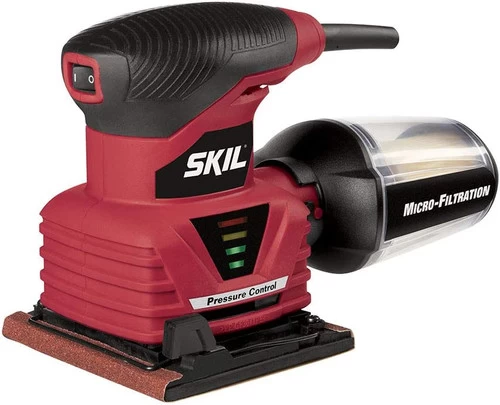 The Skil Sheet Palm Sander is the perfect tool for faster stock removal and smooth results when you’re putting the finishing touch on your project. The pressure control indicator lets you know when the right amount of pressure is applied and warns you when there’s too much. The pad brake eliminates gouging. Micro-filtration captures and contains fine dust particles to keep your work surface cleaner. A sealed switch keeps dust out of the tool for a long life. The dust canister is clear, removing the guess work of figuring out when to empty it.