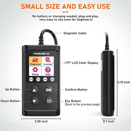 THINKOBD 20, featuring full 10 modes of OBD2 functions, DTC Lookup, 1.77” LCD color display. It’s truly an excellent OBD2 code reader that you should keep in your cars as a standard equipment. It enables DIYers and mechanics to do smog tests and solve basic engine and emission-related problems. The Thinkcar THINKOBD 20 can directly identify the code definition on the screen and no need to search online. Gives you a more intuitive understanding of the problem. With the built-in DTC look up, you just input the DTC you need to check and then it will provide the detailed definition for you to figure out the issue. It shows the DTCs and its definition at the same time, saving the trouble of searching the internet. Comparing with the same level OBD2 scanners, THINKOBD 20 is more effective and user-friendly. It is is an electronic DTCs dictionary for mechanics and the DIYer to look up the trouble codes directly. Designed with intuitive menus and 4 keys, makes it so easy to use and enables entry-level DIYers to do their own inspections and repairs.
