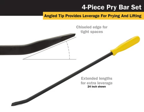 - Set includes (1) 8”, (1) 12″, (1) 18″, and (1) 24″ screwdriver pry bars