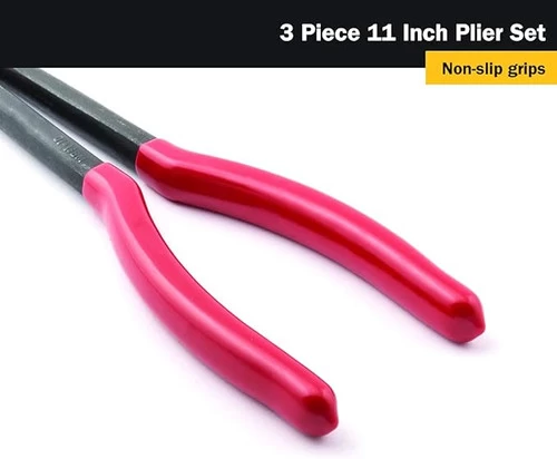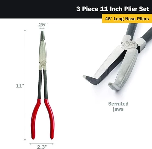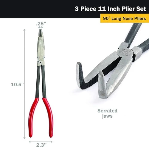 - Set includes one each: 11″ long nose pliers, 11″ 45 degree long nose pliers and 11″ 90 degree long nose pliers