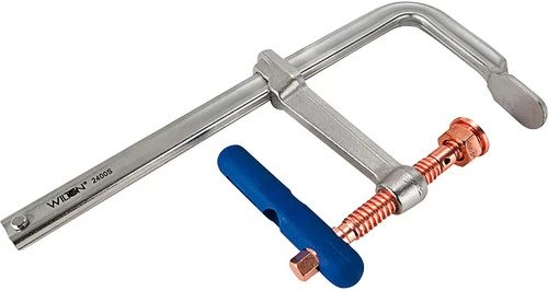 The top-of-the-line Wilton Spark-Duty series with copper spindle is superior when resisting welding spatter. Every Spark-Duty F-Clamp comes standard with an ergonomic anti-fatigue Wilton-Grip and V-Groove pad accessory. The Wilton 2400S-60C Regular Duty F-Clamp clamps down with 2,660 lb. of force and an opening capacity of 60 in. All 2400S series F-Clamps are backed with a lifetime warranty.